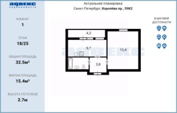 общая 32.5, жилая 15.4, кухня 9.8, прихожая 3.8, лоджия 4.3, санузел 3.6