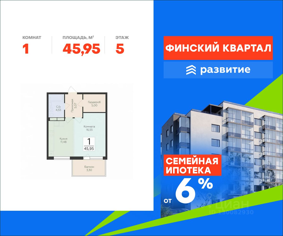 Продается квартира площадью 45.95 кв. м с отделкой white box. Квартира расположена на 5 этаже 7 этажного дома, в жилом комплексе комфорт-класса "Финский Квартал".