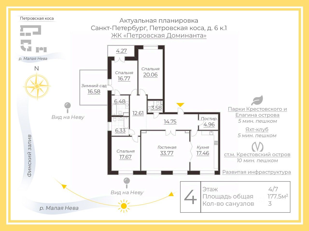 Арт. 105846449 Вашему вниманию предлагается к продаже просторная видовая 4ккв квартира в корпусе Б ЖК "Петровская Доминанта" . Интересное планировочное решение включает в себя три изолированные спальни, кухню-гостиную. В квартире есть изюминка -зимний сад с панорамными окнами. Три санузла. Из окон квартиры открывается потрясающий вид на Акваторию Невы. Комплекс премиального класса со своей набережной и яхт клубом. У квартиры есть два парковочных места.