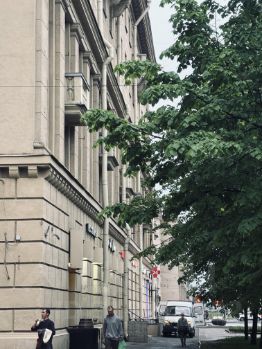 Дом построен в стиле сталинского неоклассицизма - величественные фасады, просторные парадные, высокие потолки 3,25 метра, лифт, уютные зеленые дворы.