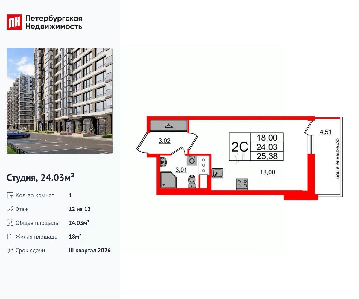 Удобная, классическая, функциональная европланировка, вместительная прихожая 3.02 м². Общая площадь студии - 24.03 м², жилая 18 м², высота потолка 3 м.