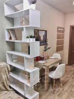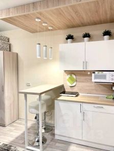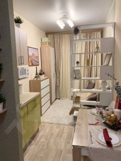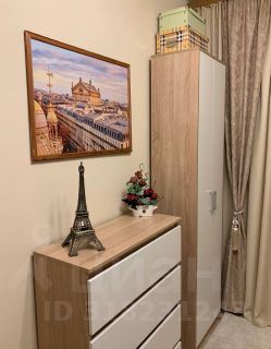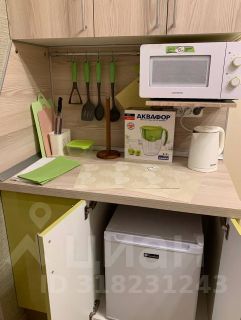 - в 1 комнате-студии площадью 10.8 кв.м. находятся кровать-комод, стол и стулья, шкаф для хранения вещей и одежды, гардеробная с зеркалом, настенные полки и большой подоконник, кухонный гарнитур с раковиной, варочной панелью и холодильником, м/в печью, чайником и посудой, стиральная машина.