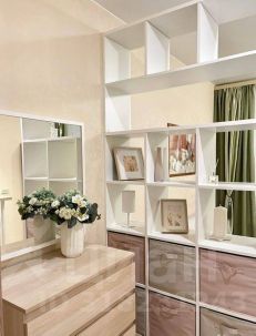 - в 4 комнате-студии площадью 11.1 кв.м. двуспальный диван, рабочее место (настенные полки, стеллаж, стол и стул), шкаф, комод и обувница для хранения вещей и одежды, гардеробная с зеркалом, кухонный гарнитур (аналогичное наполнение), стол и стулья, холодильник.