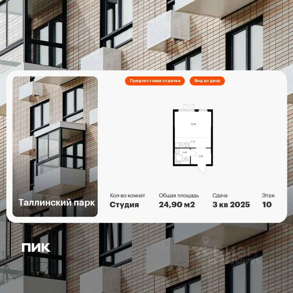 Продаётся квартира-студия площадью 24,9 кв.м на 10 этаже 12 этажного дома (Корпус 3.1, Секция 1) проекта ПИК Таллинский парк. Светлый просторный подъезд на уровне земли, функциональная планировка, большие окна, предчистовая отделка.