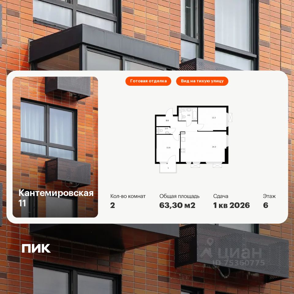 Продаётся 2-комн. квартира площадью 63,3 кв.м на 6 этаже 13 этажного дома (Корпус 5, Секция 1) проекта ПИК Кантемировская 11. Светлый просторный подъезд на уровне земли, функциональная планировка, большие окна, c отделкой.