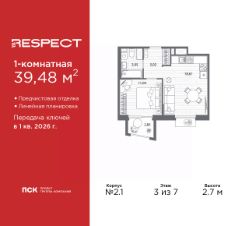Однокомнатная квартира с предчистовой отделкой в ЖК "RESPECT" на 3 этаже. Общая площадь: 39.48 кв.м., жилая: 11.04 кв.м., площадь просторной кухни-столовой: 18.61 кв.м. Все окна выходят на одну сторону. В квартире один балкон, один совмещенный санузел. Высота потолков 2.7 м.