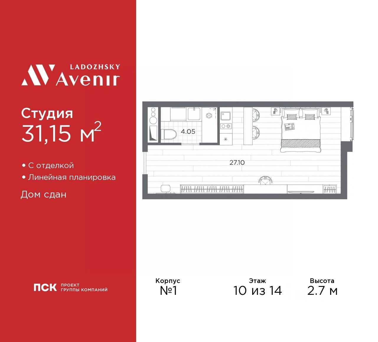 Просторные 1-комн. апартаменты-студия с отделкой в ЖК "Ladozhsky AVENIR" на 10 этаже. Общая площадь: 31.15 кв.м., площадь гостиной 27.1 кв.м., из которых 5 кв.м. выделено под кухонную зону. Все окна выходят на одну сторону. В апартаментах один совмещенный санузел. Высота потолков 2.7 м.