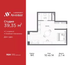 Продаются однокомнатные апартаменты-студия с отделкой в ЖК "Ladozhsky AVENIR" на 10 этаже. Общая площадь: 39.35 кв.м., площадь гостиной 34.6 кв.м., из которых 5 кв.м. выделено под кухонную зону. Все окна выходят на одну сторону. В апартаментах один совмещенный санузел. Высота потолков 2.7 м.