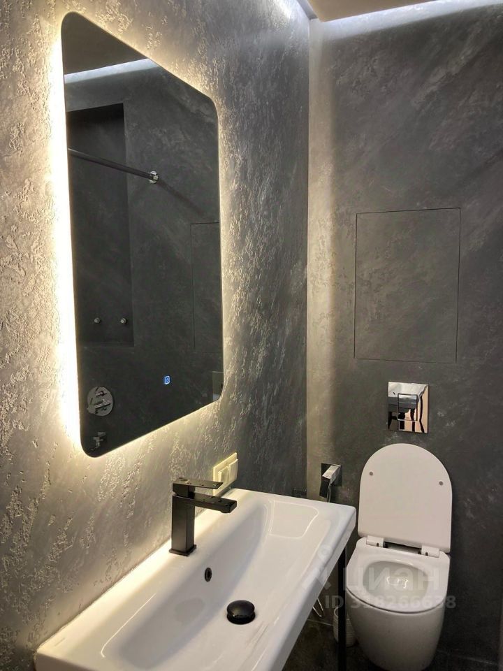 Ванна AM.PM с эргономичным экраном, обеспечивающим дополнительное пространство для ступней, скрытый тропический душ, трехпозиционный термостатический смеситель, финский подвесной безободковый унитаз с вихревым сливом на инсталляции Grohe, гигиенический душ.