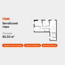 Продаётся 3-комн. квартира площадью 85,5 кв.м на 5 этаже 12 этажного дома (Корпус 6, Секция 2) проекта ПИК Витебский парк. Светлый просторный подъезд на уровне земли, функциональная планировка, большие окна, предчистовая отделка.