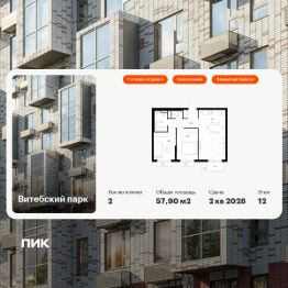 Продаётся 2-комн. квартира площадью 57,9 кв.м на 12 этаже 12 этажного дома (Корпус 6, Секция 3) проекта ПИК Витебский парк. Светлый просторный подъезд на уровне земли, функциональная планировка, большие окна, c отделкой.