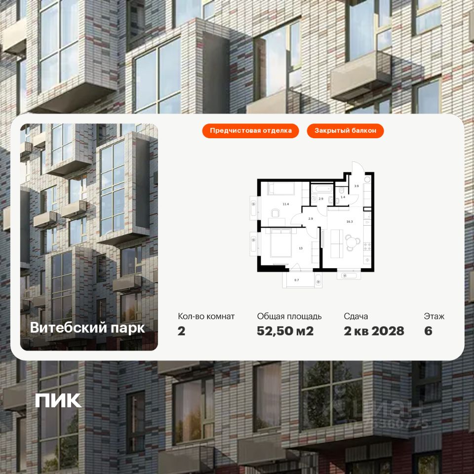 Продаётся 2-комн. квартира площадью 52,5 кв.м на 6 этаже 12 этажного дома (Корпус 6, Секция 2) проекта ПИК Витебский парк. Светлый просторный подъезд на уровне земли, функциональная планировка, большие окна, предчистовая отделка.