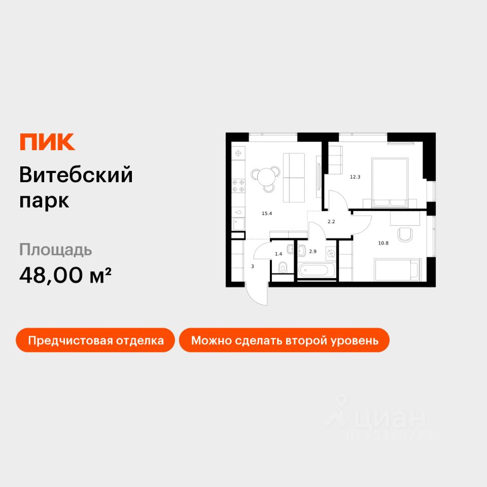 Продаётся 2-комн. квартира площадью 48 кв.м на 1 этаже 12 этажного дома (Корпус 6, Секция 1) проекта ПИК Витебский парк. Светлый просторный подъезд на уровне земли, функциональная планировка, большие окна, предчистовая отделка.