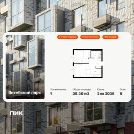 Продаётся 1-комн. квартира площадью 39,3 кв.м на 9 этаже 12 этажного дома (Корпус 6, Секция 3) проекта ПИК Витебский парк. Светлый просторный подъезд на уровне земли, функциональная планировка, большие окна, c отделкой.