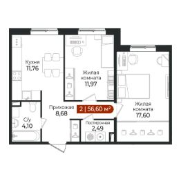 2 - комнатная квартира на 1 этаже общей площадью 56,6 м² в жилом комплексе Арт Парк от застройщика ГК Алгоритм.