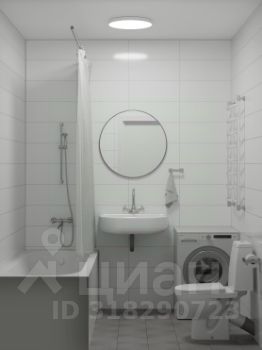 В отделке санузла также использованы светлые оттенки. Функциональная мебель и сантехника подобраны с учетом эргономики помещения, создавая максимальный комфорт при использовании.
