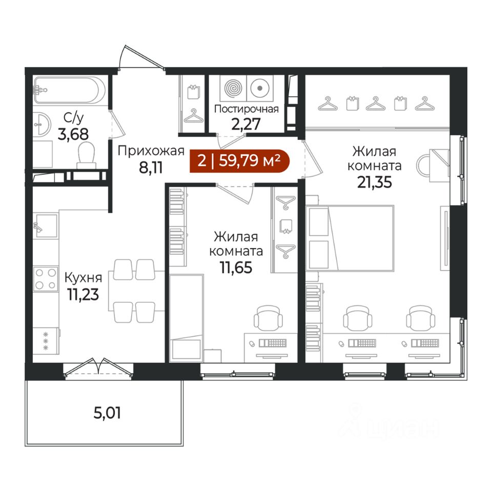 2 - комнатная квартира на 3 этаже общей площадью 59,79 м² в жилом комплексе Арт Парк от застройщика ГК Алгоритм.