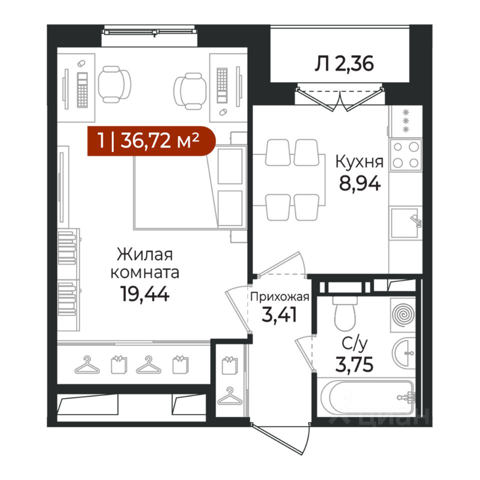 1 - комнатная квартира на 4 этаже общей площадью 36,72 м²  в жилом комплексе Арт Парк от застройщика ГК Алгоритм.