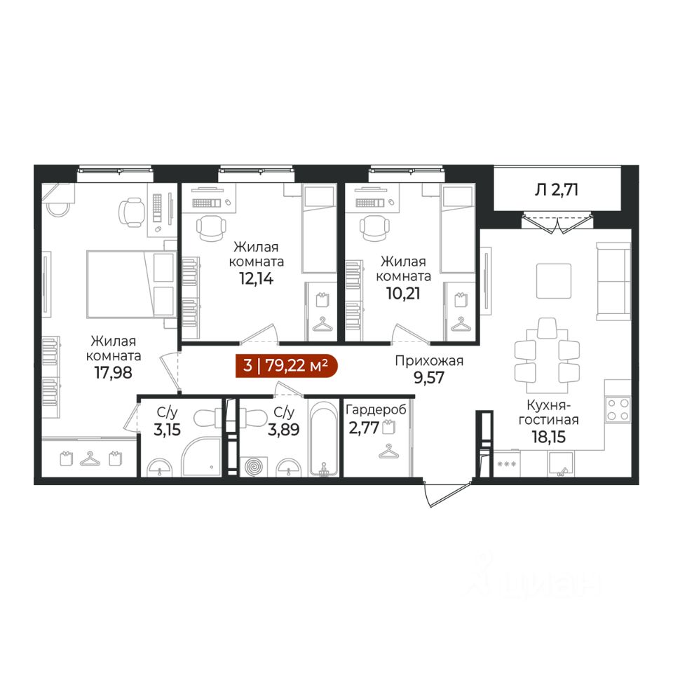 3 - комнатная квартира на 5 этаже общей площадью 79,22 м² в жилом комплексе Арт Парк от застройщика ГК Алгоритм.