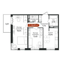 2 - комнатная квартира на 7 этаже общей площадью 56,69 м² в жилом комплексе Арт Парк от застройщика ГК Алгоритм.
