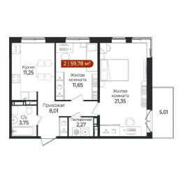 2 - комнатная квартира на 7 этаже общей площадью 59,78 м² в жилом комплексе Арт Парк от застройщика ГК Алгоритм.