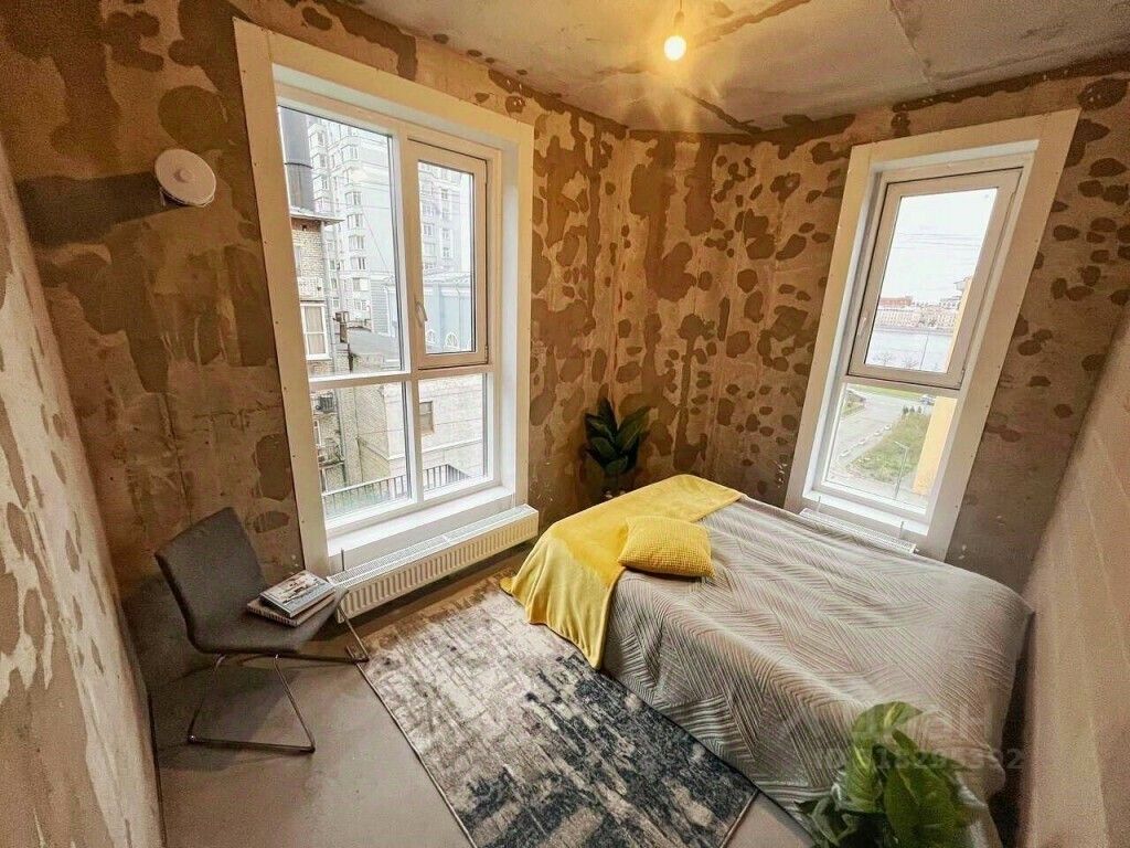 Обособленная мастер-спальня с панарамными окнами на две стороны — пространство для отдыха без компромиссов. Вид на Неву.