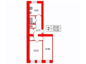 Общая площадь квартиры 54.5 кв.м. Просторные жилые комнаты 15.1 кв.м., 14.5 кв.м. Кухня квадратная 8.2 кв.м. Санузел раздельный. Высота потолков 3м.
