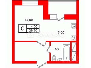 -Общая площадь — 30,7 кв. м, высота потолков — 2,73 м.