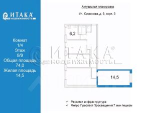площадью 14.5 метров, рядом с метро пр.Просвещения (пешком 7 минут!)
