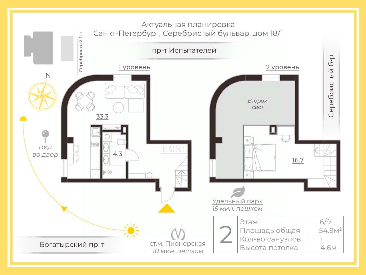 Арт. 105853873 Представляем вашему вниманию уникальные 2-х уравневые апартаменты 54,9 м2 с высокими потолками (4,6 м) в Апарт отеле 4* Serebro by Avenue-Apart.
