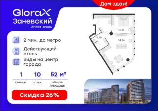 Продается 1-комн. апартамент на 10-м этаже в сданном Апарт-комплексе бизнес-класса "GloraX Заневский". Ключи сразу! Общая площадь лота составляет 51,64 кв. м, из которых 12,48 кв. м отведено под жилую. Номер апартамента - 1 036.