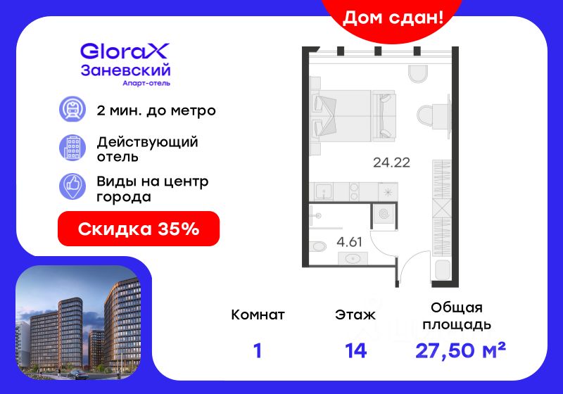 Продается апартамент-студия на 14-м этаже в сданном Апарт-комплексе бизнес-класса "GloraX Заневский". Ключи сразу! Общая площадь лота составляет 28,83 кв. м, из которых 24,22 кв. м отведено под жилую. Номер апартамента - 1 420.