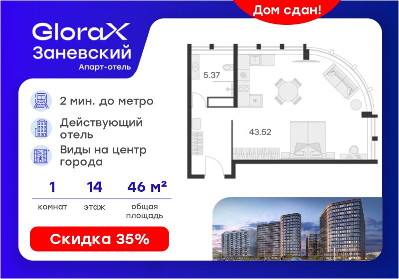Апартаменты "GloraX Заневский" - проект бизнес-класса с развитой инфраструктурой, удовлетворяющей все потребности самых взыскательных гостей. Располагается в одном из наиболее перспективных, районов Петербурга в 2х минутах от метро "Ладожская" и в 10 минутах от Невского проспекта.