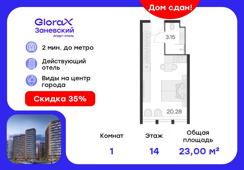 Продается апартамент-студия на 14-м этаже в сданном Апарт-комплексе бизнес-класса "GloraX Заневский". Ключи сразу! Общая площадь лота составляет 23,43 кв. м, из которых 20,28 кв. м отведено под жилую. Номер апартамента - 1 438.