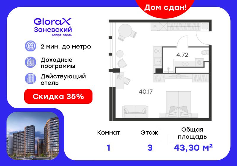 Продается апартамент-студия на 3-м этаже в Апарт-отеле "GloraX Заневский" с сервисом 4*. Старт работы отеля - декабрь 2024 г.! Общая площадь лота составляет 44,89 кв. м, из которых 40,17 кв. м отведено под жилую. Номер апартамента - 321.