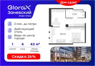 Продается 1-комн. апартамент на 4-м этаже в Апарт-отеле "GloraX Заневский" с сервисом 4*. Старт работы отеля - декабрь 2024 г.! Общая площадь лота составляет 44,56 кв. м, из которых 38,63 кв. м отведено под жилую. Номер апартамента - 409.