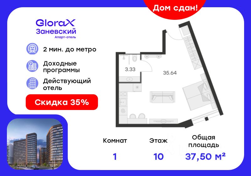 Продается апартамент-студия на 10-м этаже в сданном Апарт-комплексе бизнес-класса "GloraX Заневский". Ключи сразу! Общая площадь лота составляет 38,97 кв. м, из которых 35,64 кв. м отведено под жилую. Номер апартамента - 1 014.