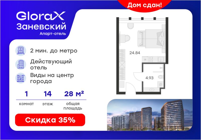 Продается апартамент-студия на 14-м этаже в сданном Апарт-комплексе бизнес-класса "GloraX Заневский". Ключи сразу! Общая площадь лота составляет 29,77 кв. м, из которых 24,84 кв. м отведено под жилую. Номер апартамента - 1 410.