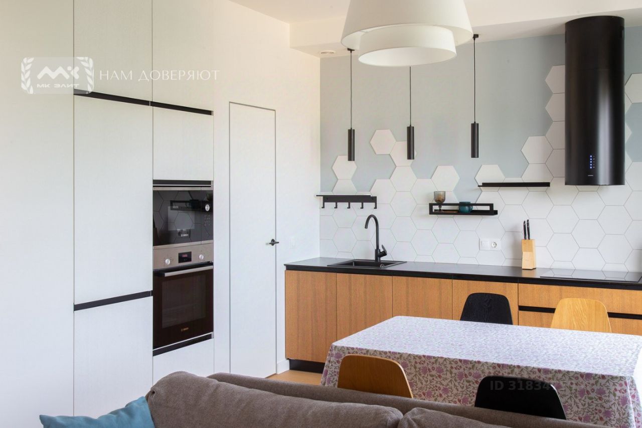 Кухонная техника Bosh и Haier, сантехника AM.PM, кухня из шпона ясеня, мебель La Redoute и AM.PM из массива дуба и шпона. Вся мебель и техника остаются новым владельцам.