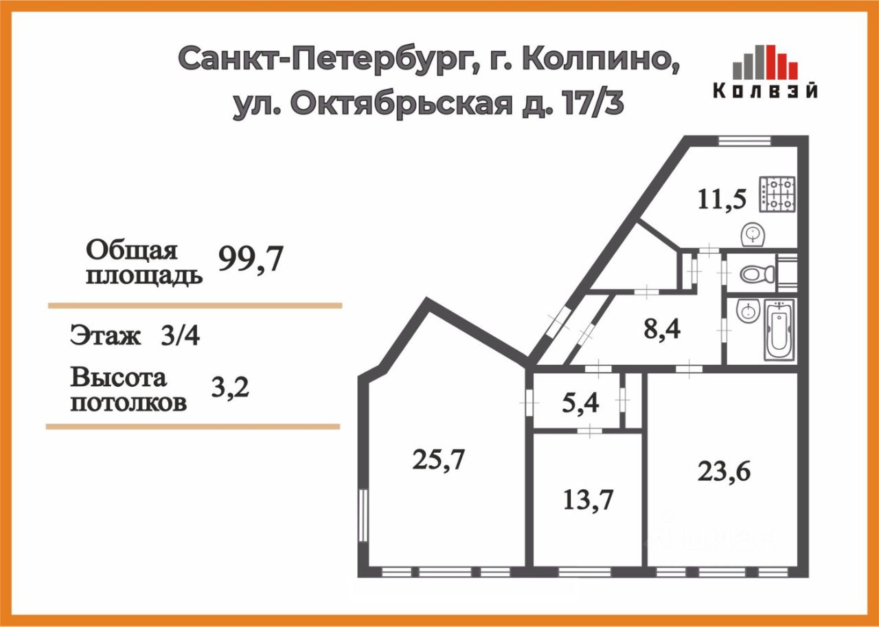 1-02; Предлагается к продаже отличная, просторная, трехкомнатная квартира площадью 99,7 м ² на третьем этаже четырехэтажного кирпичного дома, 1954 года постройки, расположенного по адресу г.Колпино, улица Октябрьская, дом 17/3.