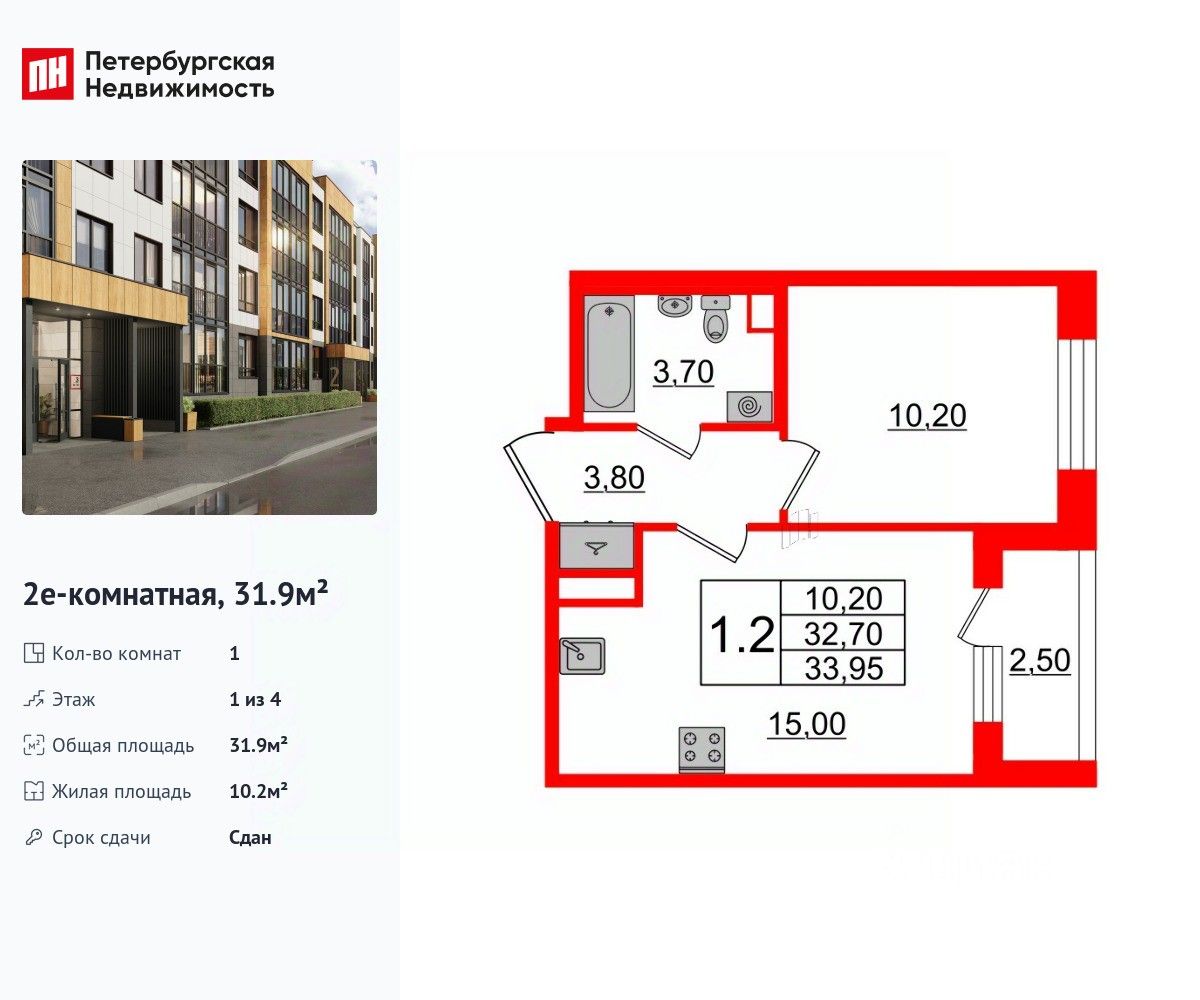 Удобная, классическая, функциональная европланировка, большая кухня-гостиная 15 м², вместительная прихожая 3.8 м². Общая площадь квартиры - 31.9 м², жилая 10.2 м², высота потолка 2.76 м.
