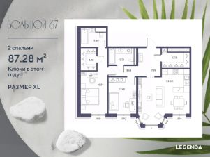 Просторная 2-комн. квартира с предчистовой отделкой в ЖК "Большой, 67" на 7 этаже. Общая площадь: 88.5 кв.м., жилая: 28.32 кв.м., площадь просторной кухни-столовой: 28 кв.м. Комнаты изолированные, все окна выходят на одну сторону. В квартире два совмещенных санузла. Высота потолков 2.98 м.