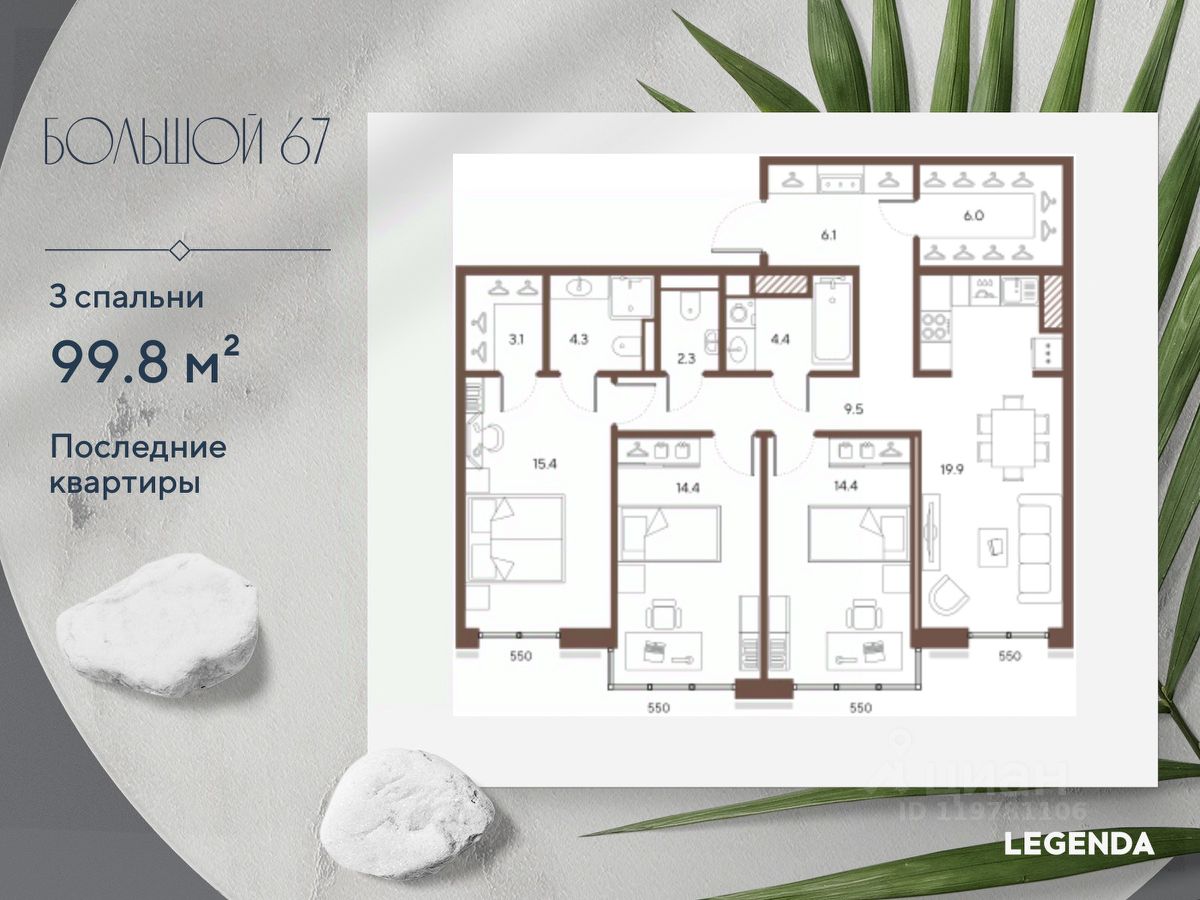 Продается 3-комн. квартира с предчистовой отделкой в ЖК "Большой, 67" на 7 этаже. Общая площадь: 99.8 кв.м., жилая: 43.95 кв.м., площадь просторной кухни-столовой: 20.14 кв.м. Комнаты изолированные, все окна выходят на одну сторону. В квартире один совмещенный и один раздельный санузел. Высота потолков 2.98 м.