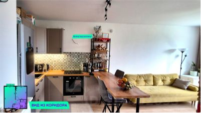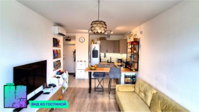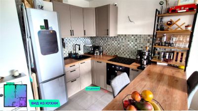 Современная кухня-гостиная оснащена встроенной техникой (духовка, посудомойка, плита), холодильник. В комплекте система очистки воды и запасной натяжной потолок.