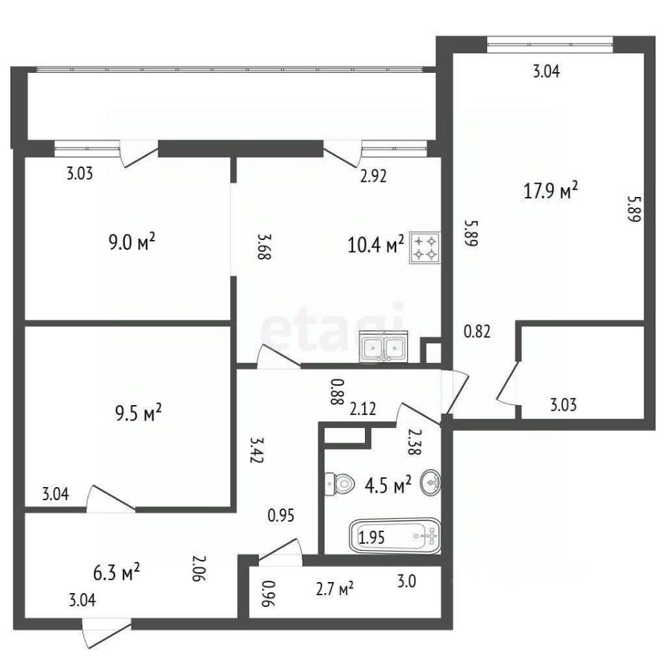 Квартира общей площадью 65,4 кв.м. + большая лоджия 6,5 кв.м.
