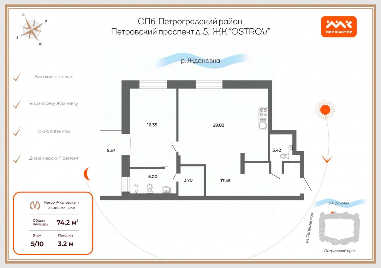 Окна квартиры выходят в сторону реки Ждановки, что позволит вам наслаждаться прекрасными закатами и проходящими в Финский залив яхтами. Мебель в гостинной, а также кухонный гарнитур привезен из Италии, кухонная встроенная техника, профессиональная кофемашина, винный шкаф, индукционная варочная панель и мультифункциональный духовой шкаф Neff, столешница и подоконники выполнены из гранита так же привезенного из Италии.