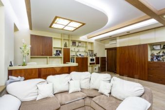 Сердце квартиры - элитарный рабочий кабинет, он же зал для совещаний. Натуральные фактуры дерева, текстиля, а также картины на стенах, создают абсолютно рабочую атмосферу. Кабинет оборудован современными системами: видеопроектор, экран, автоматические замки, система вентиляции и кондиционирования. В углу размещен действующий камин из искусственного мрамора. Большая светлая приемная комната с ресепшен для секретаря.