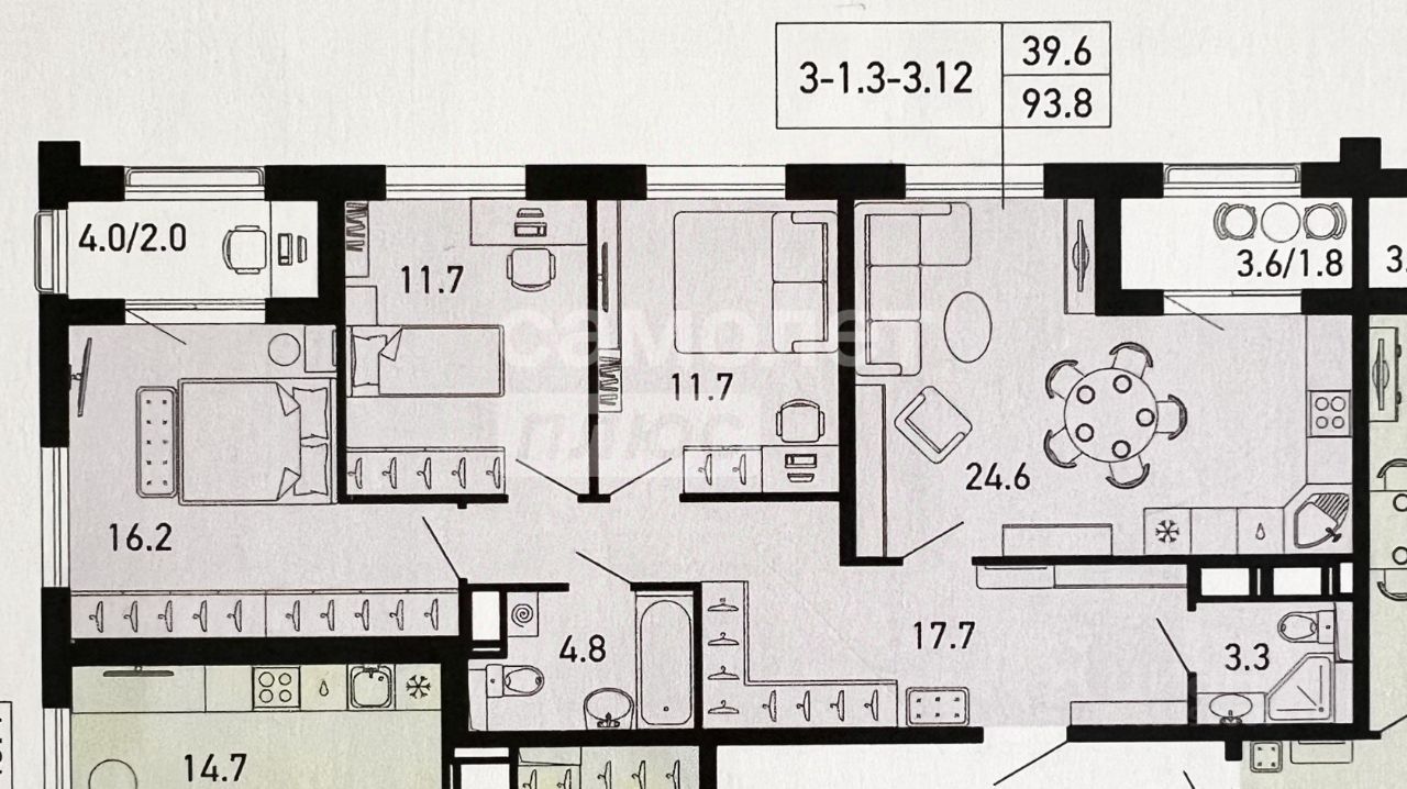 Площадь квартиры 90,1 кв.м. +2 лоджии 4,0 и 3,6 кв.м.