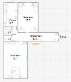 Общая площадь квартиры 69.6 кв.м с 2-мя большими изолированными комнатами (25.4 кв.м., 17.5 кв.м.), кухня 9.7 кв.м., санузлы раздельные. В большой прихожей 11 кв.м., расположен встроенный шкаф. Высота потолков 3м.