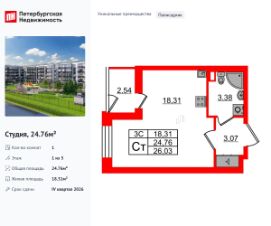 Уникальная, функциональная европланировка, вместительная прихожая 3.07 м². Общая площадь студии - 24.76 м², жилая 18.31 м², высота потолка 2.77 м.